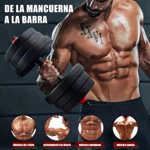 SET DE ENTRENAMIENTO COMPLETO: BARRA DE MANCUERNAS MULTIFUNCIONAL PARA TODAS SUS NECESIDADES. CONVIERTA SUS MANCUERNAS EN UN EQUIPO DE LEVANTAMIENTO DE PESAS. PERFECTA PARA AUMENTAR LA MASA MUSCULAR, MEJORAR LA RESISTENCIA MUSCULAR, FAVORECER LA SALUD CARDIOVASCULAR, PROMOVER LA PÉRDIDA DE PESO Y AUMENTAR LA RESISTENCIA AERÓBICA. TAMBIÉN AYUDA A DESARROLLAR LA FUERZA GENERAL DE LA PARTE SUPERIOR DEL CUERPO Y A ESCULPIR LOS MÚSCULOS CENTRALES.