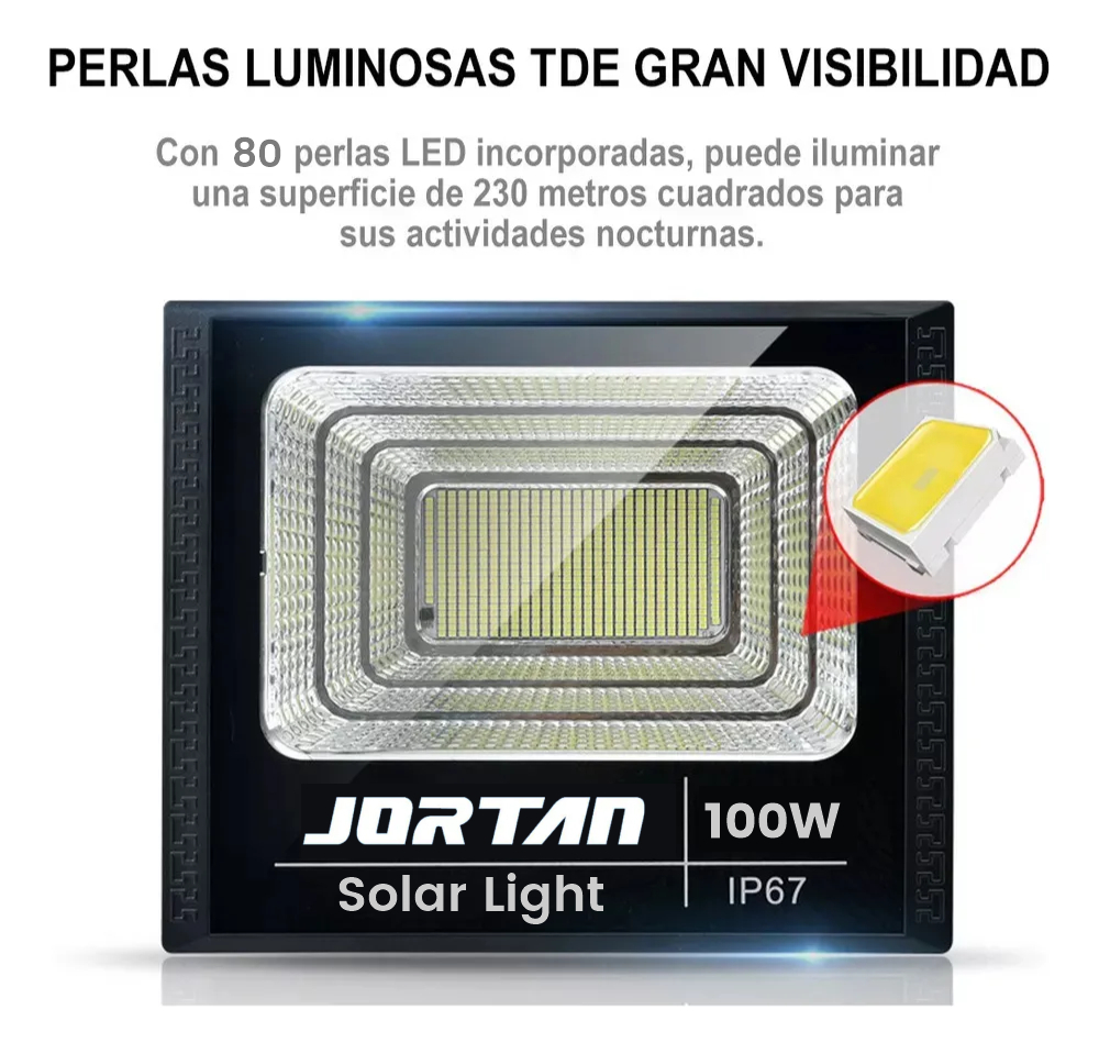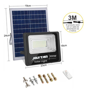 ILUMINA TUS ESPACIOS EXTERIORES CON LA LÁMPARA REFLECTOR SOLAR JORTAN 100W, UNA OPCIÓN EFICIENTE Y DURADERA QUE COMBINA TECNOLOGÍA LED DE ALTO RENDIMIENTO CON UN PANEL SOLAR DE CARGA RÁPIDA. IDEAL PARA JARDINES, PATIOS, FACHADAS, PARQUES Y ZONAS DE SEGURIDAD, BRINDA LUZ INTENSA SIN CONSUMIR ELECTRICIDAD.