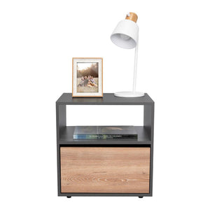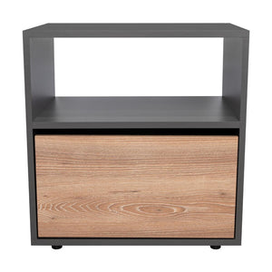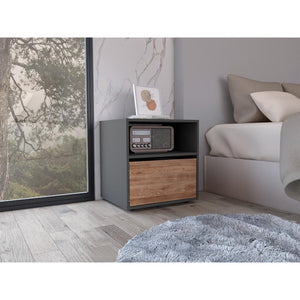 MESA DE NOCHE GALANTO, PLATA OSCURO Y MIEL, CON UNA PUERTA BATIENTE