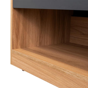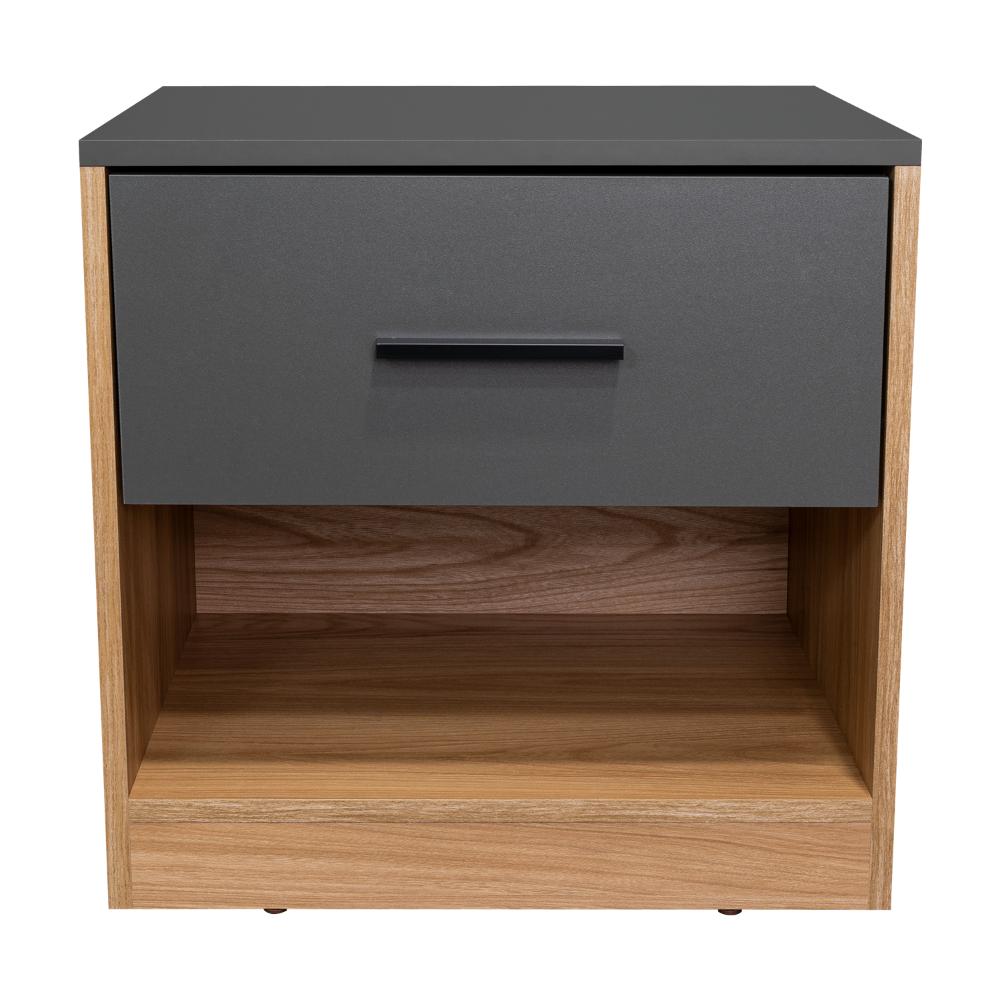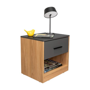 MESA DE NOCHE GIROA, PLATA OSCURO Y FRESNO EUROPEO, CON ESPACIO PARA COLOCAR OBJETOS DECORATIVOS