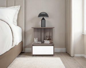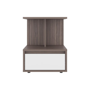 MESA DE NOCHE MIKE, AVELLANA Y BLANCO DUQUEZA, CON UN CAJON MULTIUSOS
