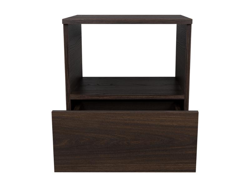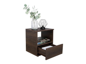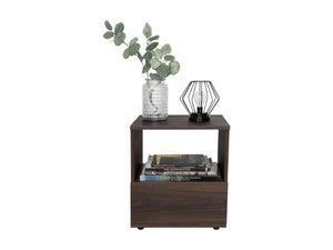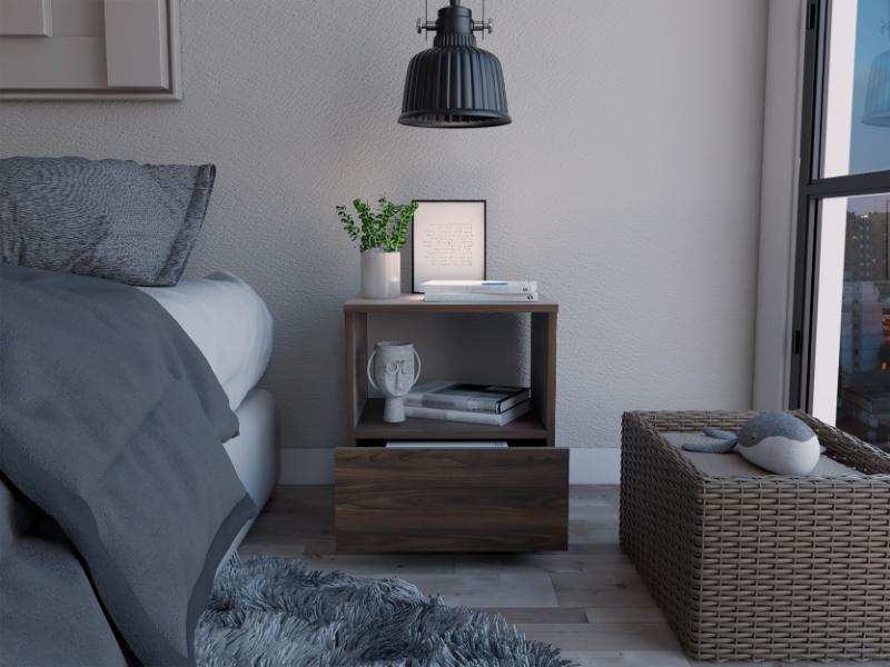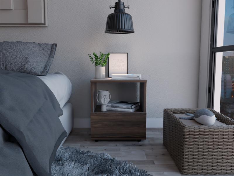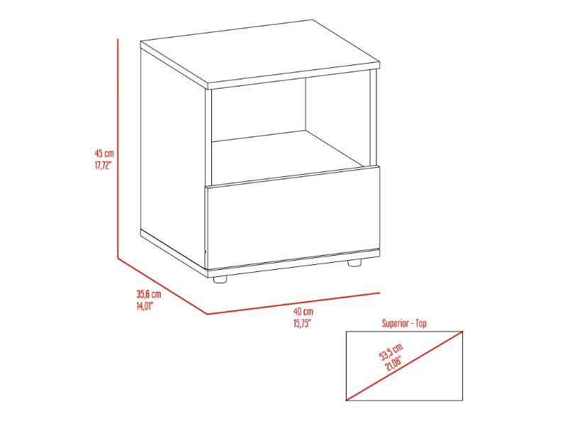 Mesa de noche con Diseño práctico, Espacio para colocar objetos decorativos, un cajón inferior deslizable, deslizadores plásticos, fácil armado e instalación.