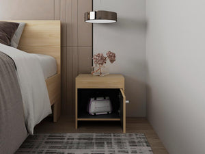 MESA DE NOCHE TUTTO, FRESNO EUROPEO Y WENGUE, CON CAJÓN PARA GUARDAR OBJETOS IDEAL PARA ESPACIOS REDUCIDOS