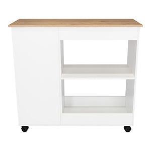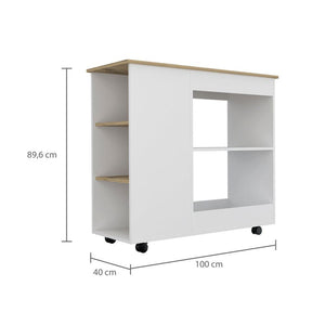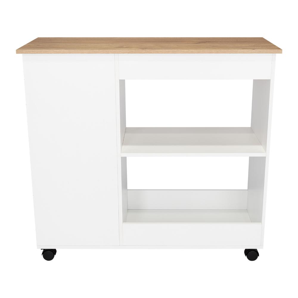 MESA AUXILIAR DE COCINA CORALYN, BLANCO Y CAFÉ CLARO, CON TRES ENTREPAÑOS Y RODACHINES