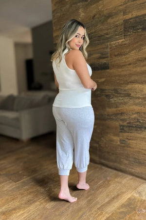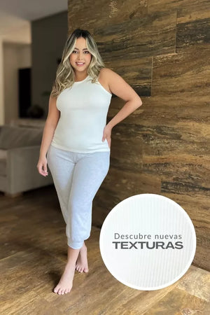 Una pijama diferente, cómoda y con mucho estilo. Su pantalón tipo jogger en burda y la camisilla en rib hacen de este conjunto una opción ideal para relajarte con total frescura.