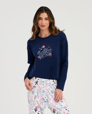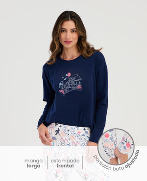 PIJAMA DE DOS PIEZAS QUE COMBINA ESTILO Y CONFORT PARA TUS NOCHES DE DESCANSO. LA CAMISETA CUELLO REDONDE Y DE MANGA LARGA CON ESTAMPADO FRONTAL TE MANTIENE ABRIGADA