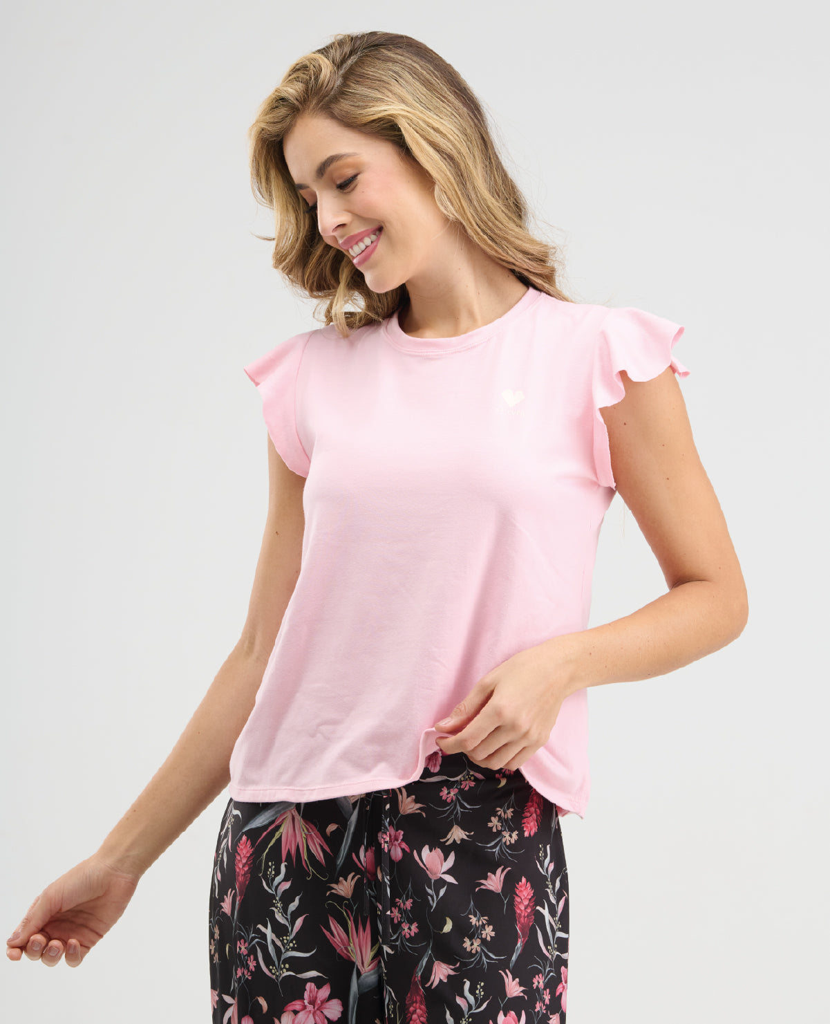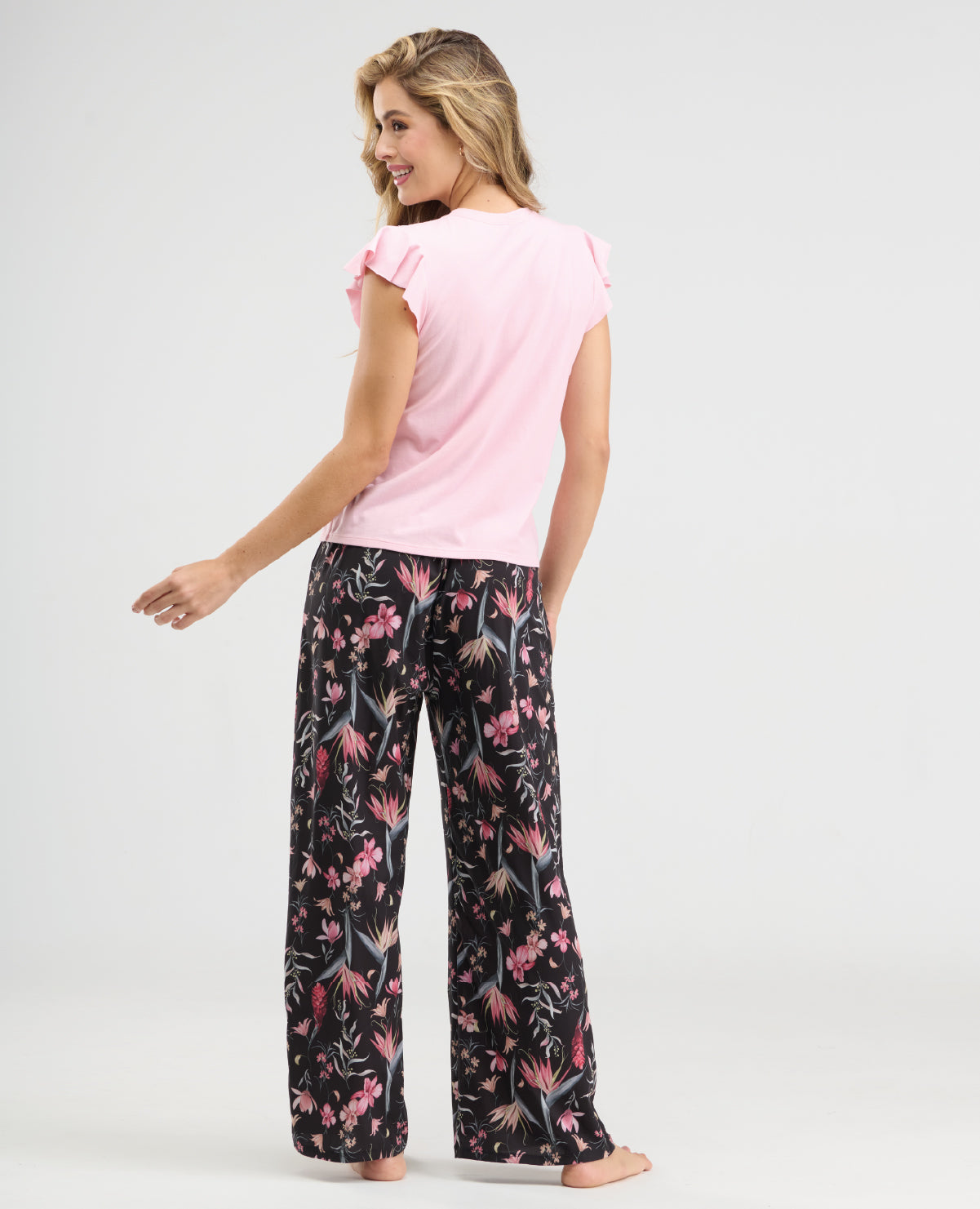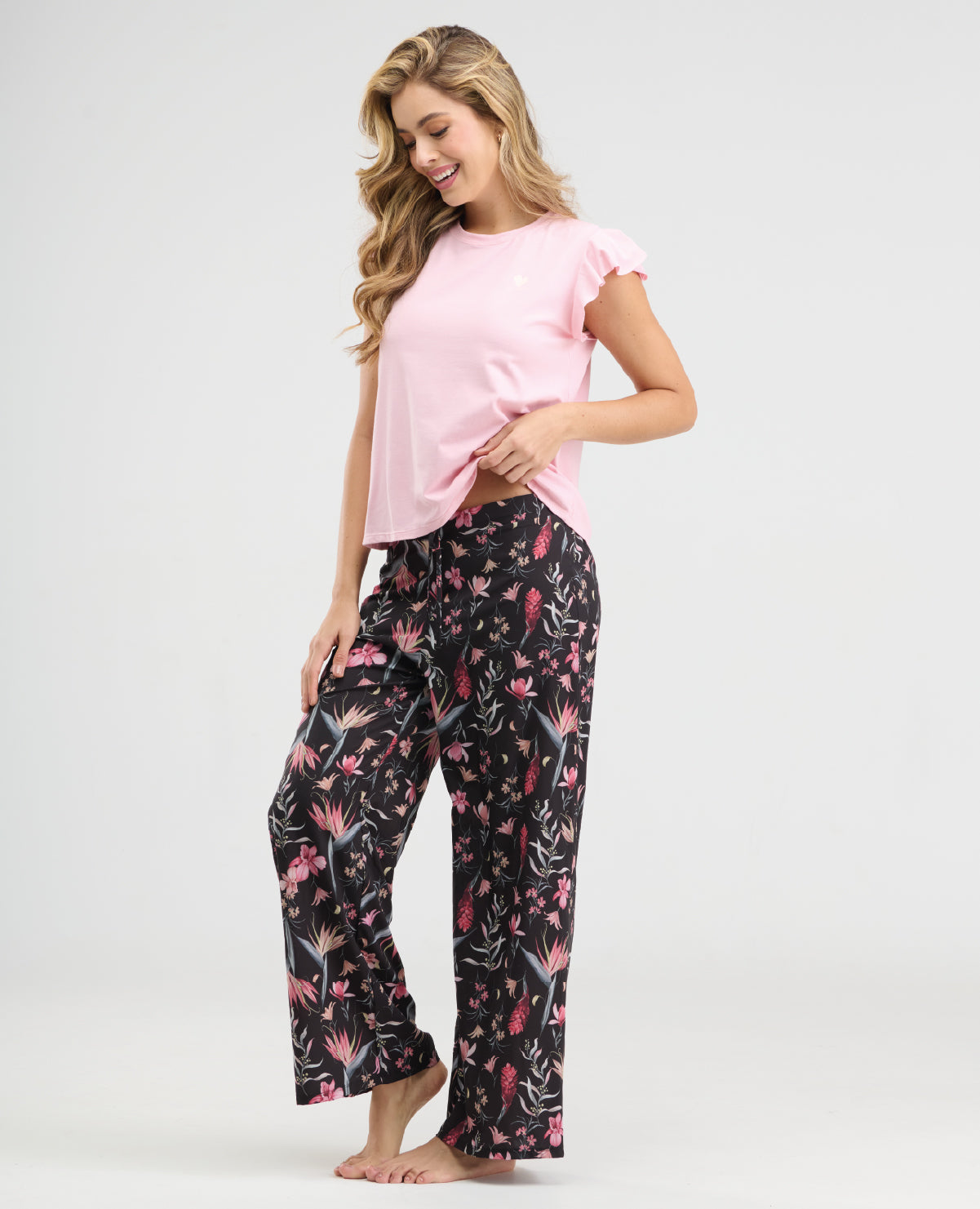 CAMISETA CON MANGAS CORTAS TIPO BOLERO PARA DARLE UN TOQUE MÁS DIVERTIDO Y SILUETA AMPLIA. PANTALÓN LARGO RECTO CON ELÁSTICO EN CINTURA PARA UN MEJOR AJUSTE. POLIÉSTER / ELASTANO.