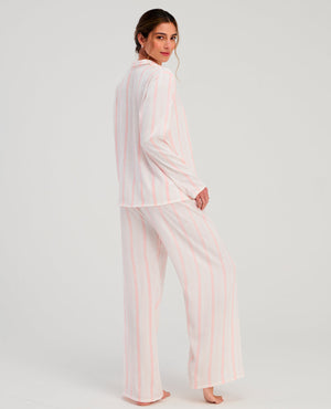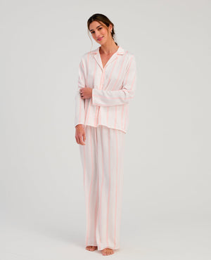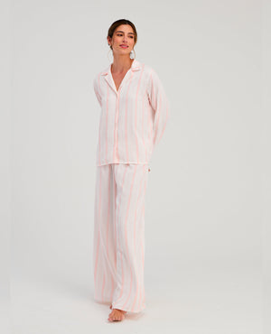 PIJAMA DE CAMISA MANGA LARGA CON BOTONES PARA UN TOQUE MAS ELEGANTE Y PANTALÓN LARGO CON CINTURA ELÁSTICA QUE ASEGURA UN AJUSTE ÓPTIMO Y UNA COMODIDAD EXCEPCIONAL. ELABORADO EN UN MATERIAL LÍGERO Y FRESCO DE TEJIDO PLANO, PARA UN DESCANSO IDEAL. POLIÉSTER/SPANDEX.