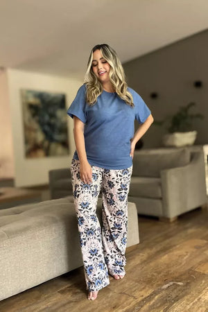 Disfruta la frescura de su pantalón en piel de durazno con estampado floral y la suavidad de su blusa en algodón doble punto. Una combinación perfecta para sentirte cómoda, libre y bonita mientras descansas o compartes un momento tranquilo en casa.