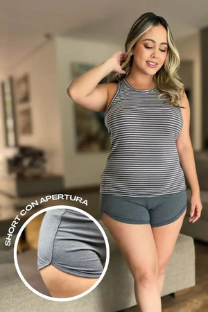 Una opción fresca y moderna para tus noches. Su short y blusa tipo camisilla están elaborados en lycra algodón, con un diseño preteñido que le da un toque actual. Ideal para quienes buscan sentirse cómodas sin dejar de lado el estilo.