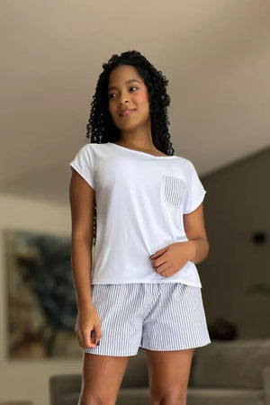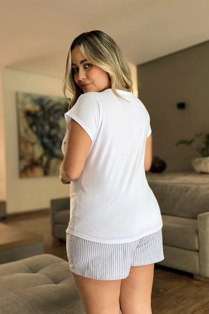 Esta pijama en short está pensada para las que aman sentirse cómodas y lindas a la vez. El tejido suave y fresco de la tela, combinado con detalles femeninos, hacen de esta prenda tu nueva favorita para descansar.