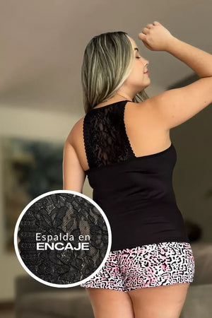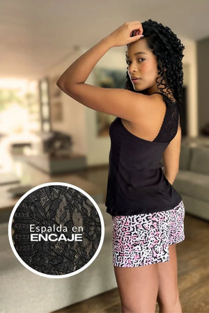 Con un estampado animal print y un delicado detalle de encaje en la parte posterior de la blusa, esta pijama corta en piel de durazno combina estilo y comodidad para que te sientas increíble incluso al dormir.