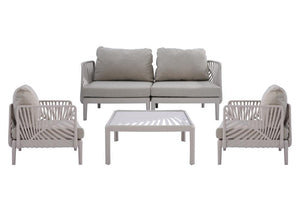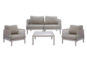 Elaborado en Polipropileno el set incluye mesa centro, dos sillas y un banco, en Color Beige