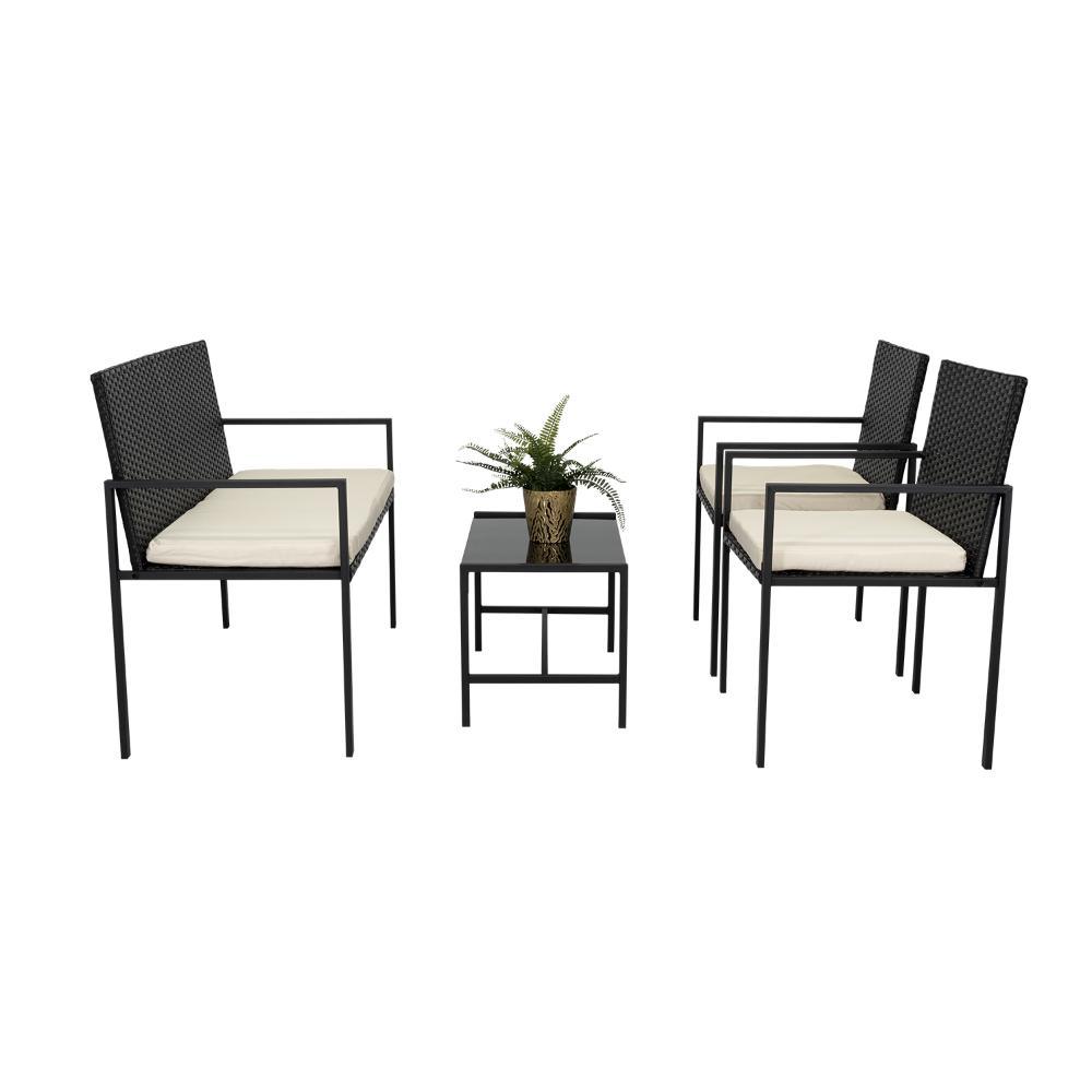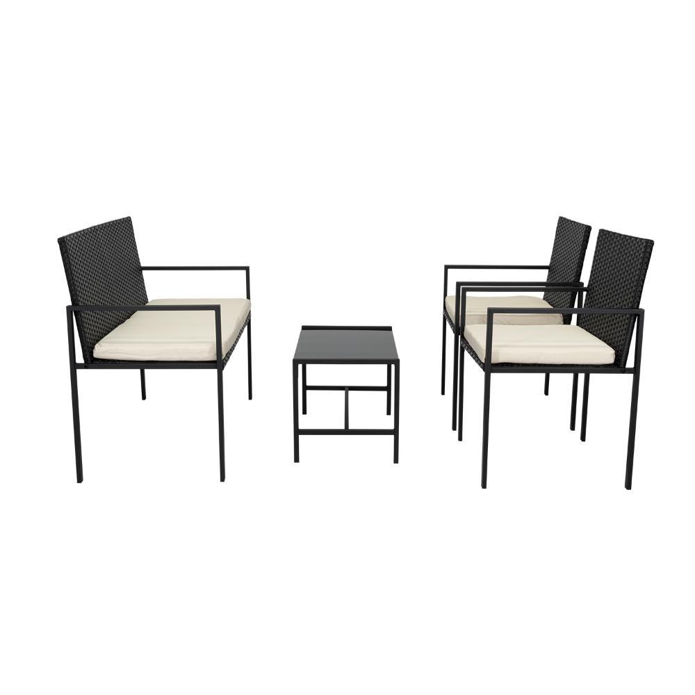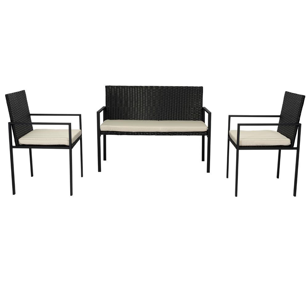 Elaborado en Rattan Sintético el set incluye mesa y tres sillas de una plaza, en Color Negro y Blanco.
