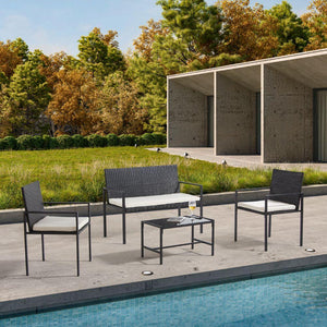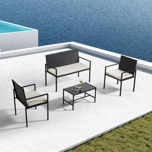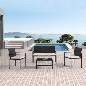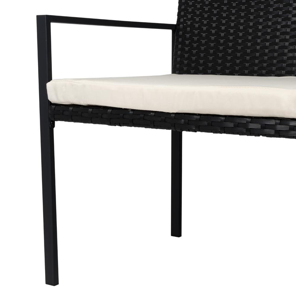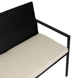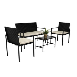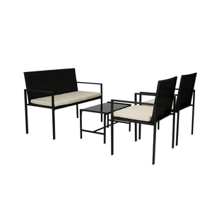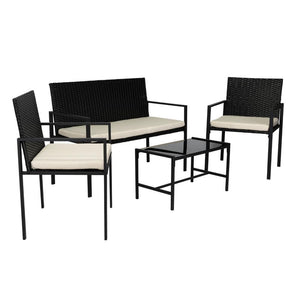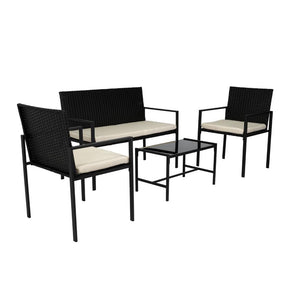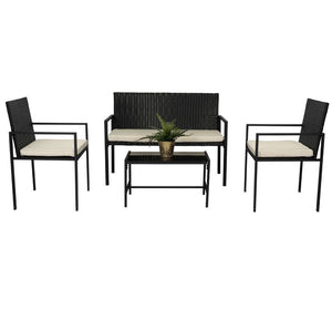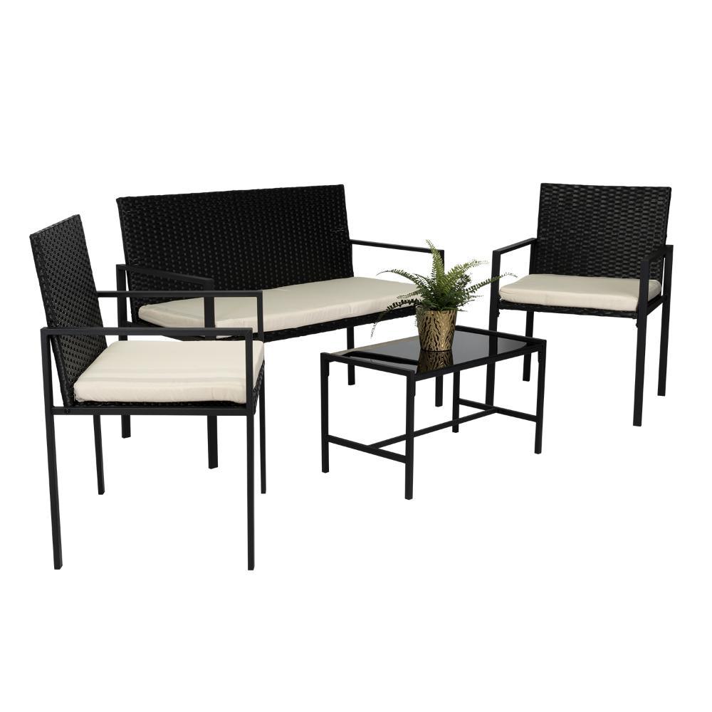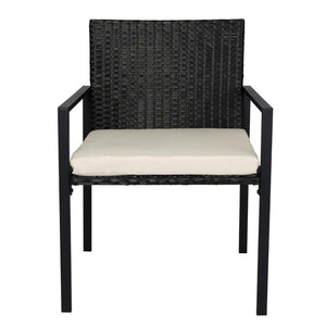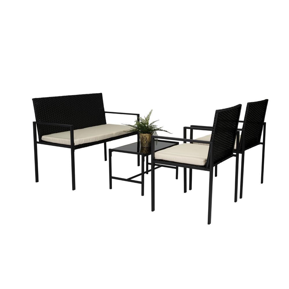 Elaborado en Rattan Sintético el set incluye mesa y tres sillas de una plaza, en Color Negro y Blanco.