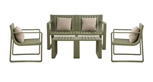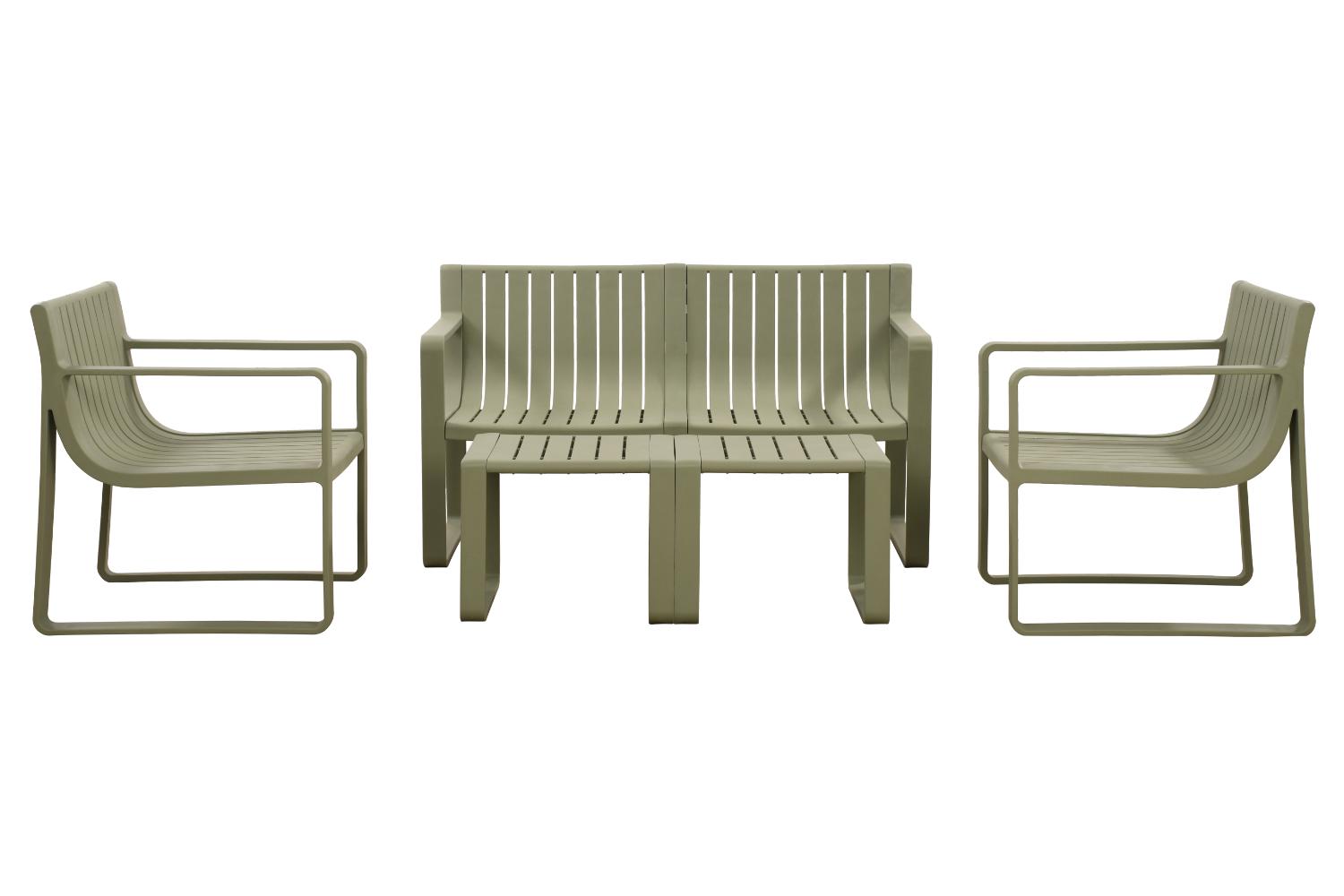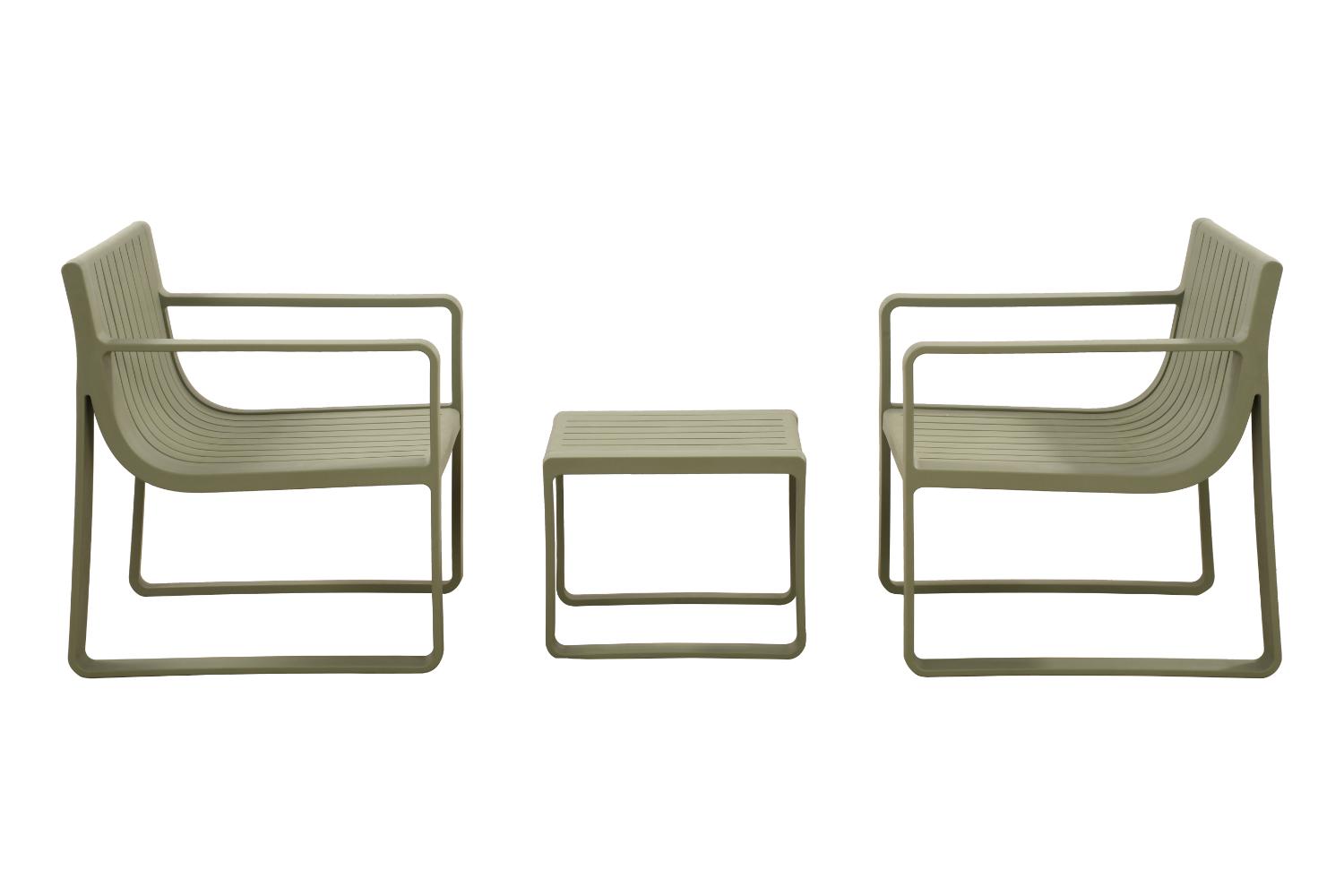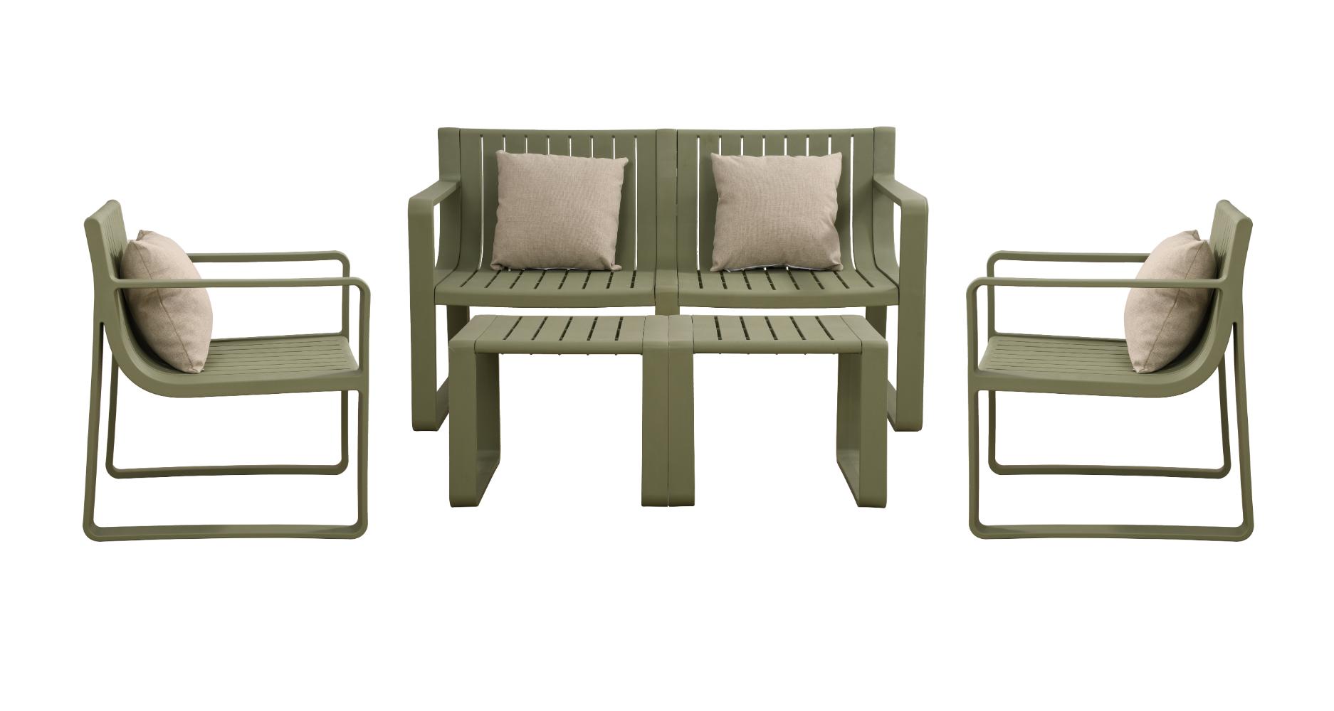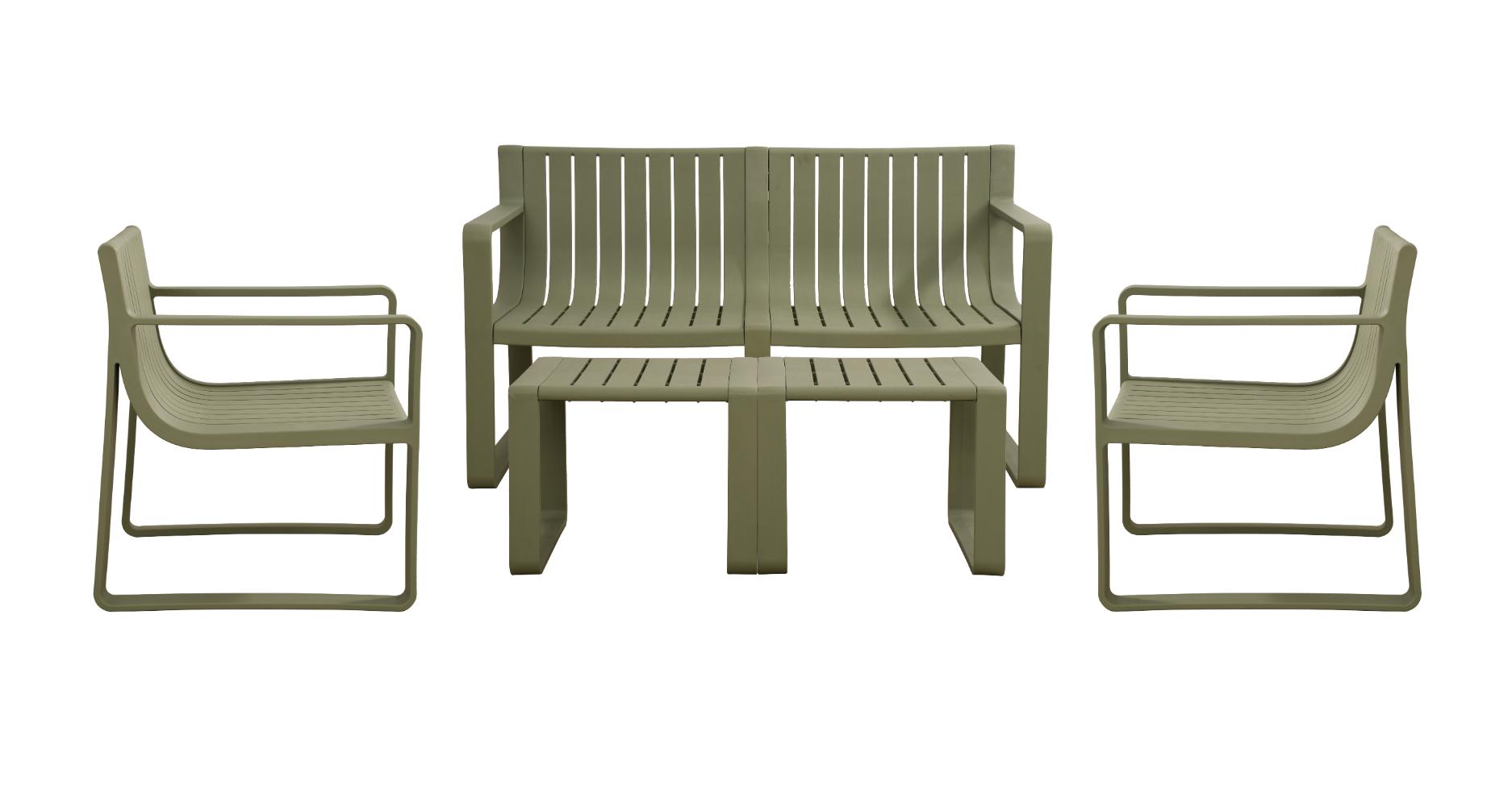 Elaborado en Polipropileno el set incluye mesa centro, dos sillas y un banco, en Color Verde Olivo