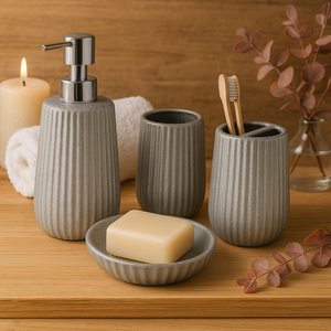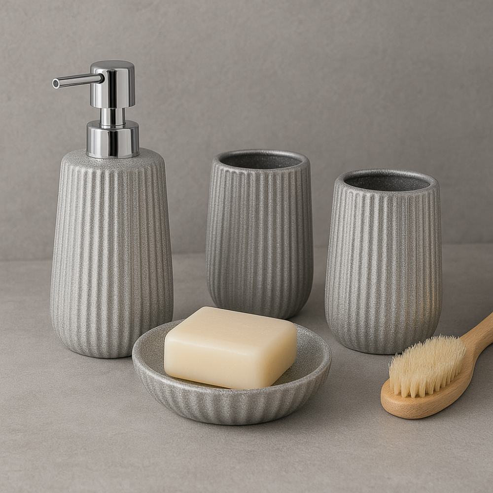 DALE UN TOQUE DE ELEGANCIA Y ORDEN A TU BAÑO CON ESTE SOFISTICADO SET DE BAÑO DE 4 PIEZAS EN CERÁMICA GRIS, DISEÑADO PARA COMBINAR FUNCIONALIDAD Y ESTILO EN CADA DETALLE. IDEAL PARA EL HOGAR, HOTELES O COMO UN REGALO CON BUEN GUSTO, ESTE SET TRANSFORMARÁ CUALQUIER ESPACIO EN UN AMBIENTE DE SPA MODERNO Y ACOGEDOR.