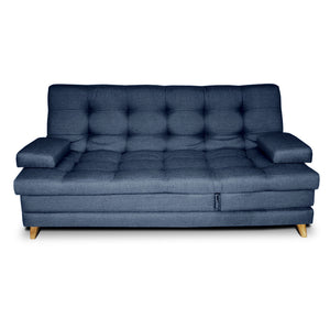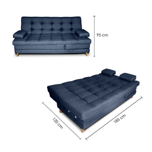 Sofá cama 3 cuerpos, con diseño funcional 5 posiciones: modo sofá, reclinado, cama, diván y diván reclinado. Ideal para optimizar tus espacios con máximo confort. Tapizado en tela lino de excelente durabilidad, con descansa brazos ajustables y patas de madera. Estructura de madera inmunizada y espumas de alta densidad. Cobertura de envío gratis: