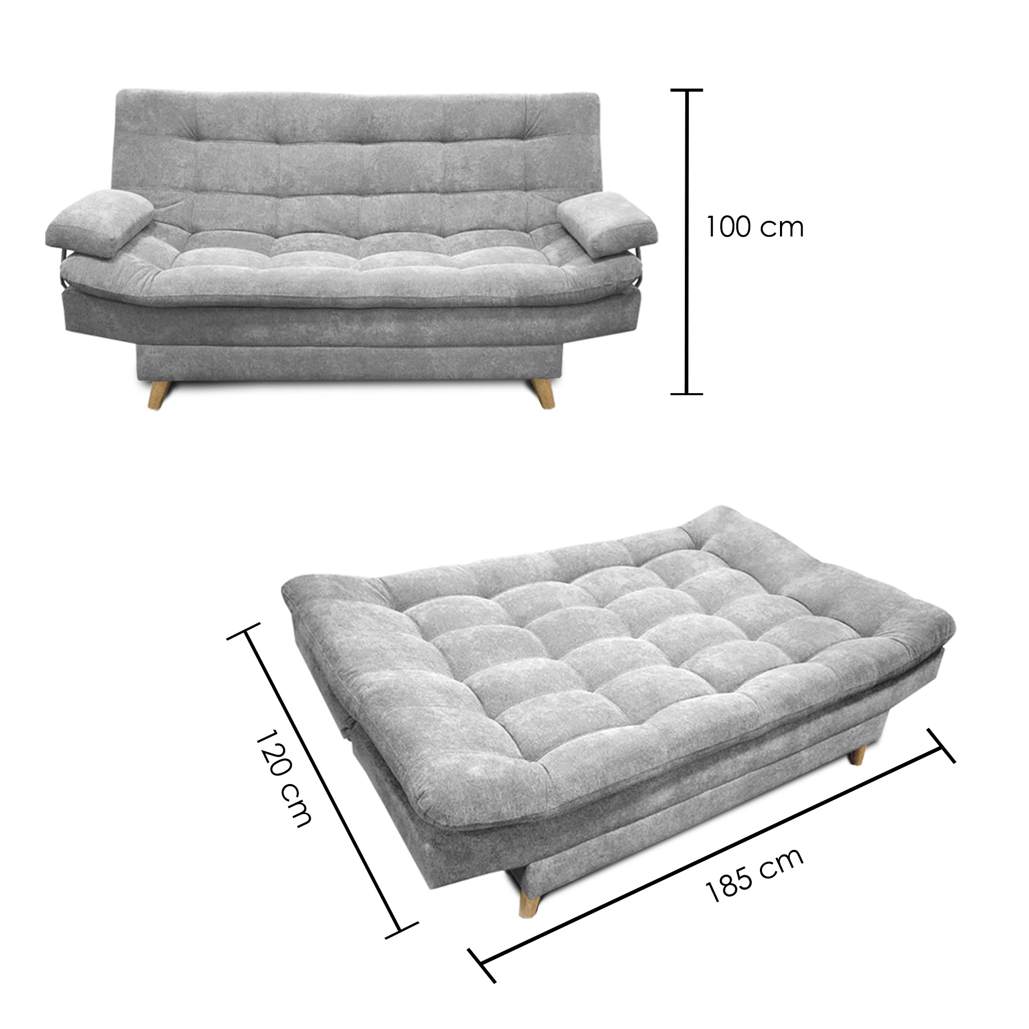 Sofá cama con diseño funcional 3 cuerpos y 3 posiciones: modo sofá, reclinado y cama. Ideal para optimizar tus espacios. Tapizado en tela lino de excelente calidad, con descansa brazos ajustable para máximo confort. Patas terminado tipo madera. Estructura en madera inmunizada y espumas de alta densidad. Cobertura de envío gratis: