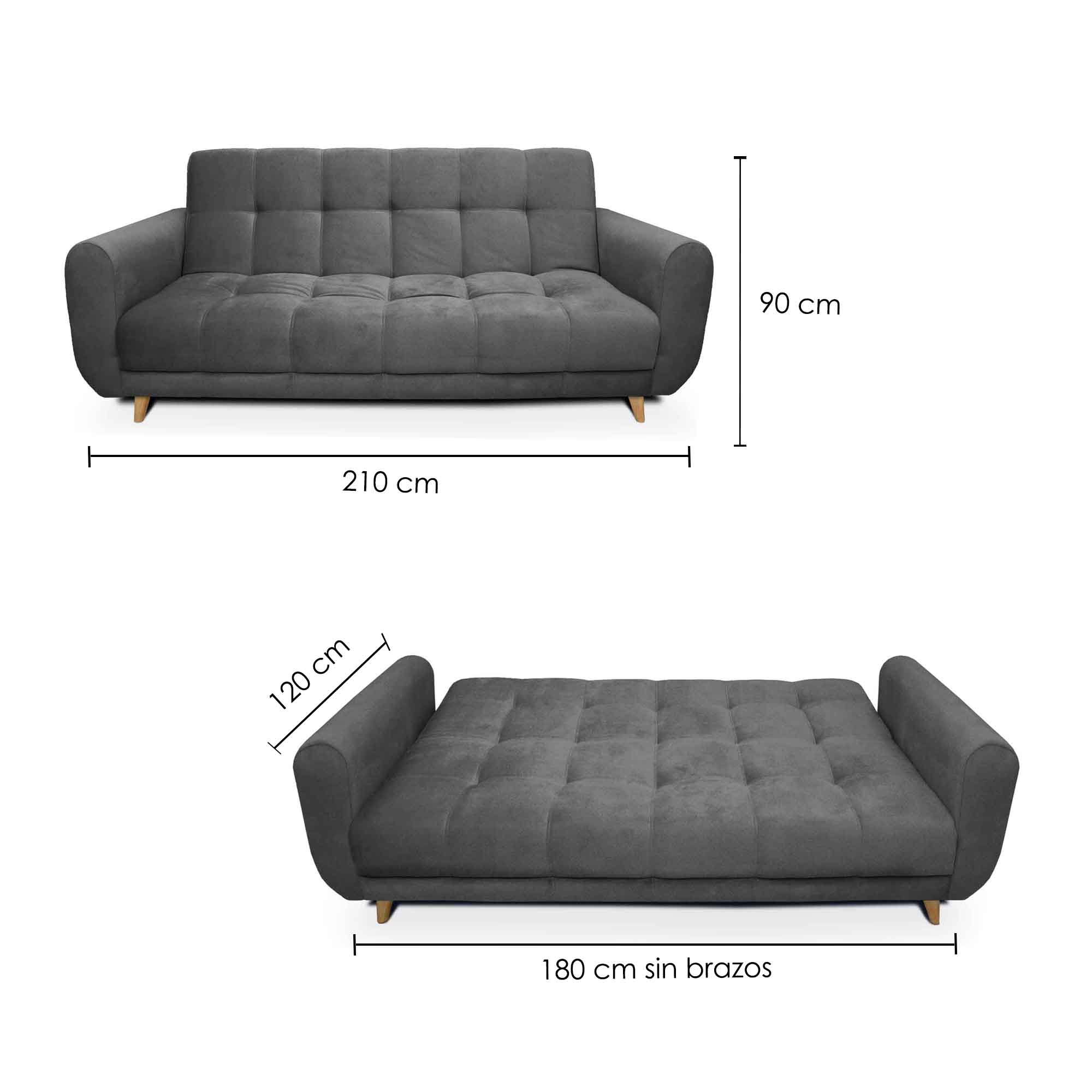 Sofá cama 3 cuerpos y 3 posiciones: modo sofá, reclinado y cama. Con diseño funcional. Ideal para optimizar tus espacios y conseguir el máximo confort, tapizado en tela tipo piel de durazno suave al tacto. Con descansa brazos reforzados para mayor estabilidad y patas en madera. Estructura en madera inmunizada. Espumas de alta densidad. Cobertura de envío gratis: