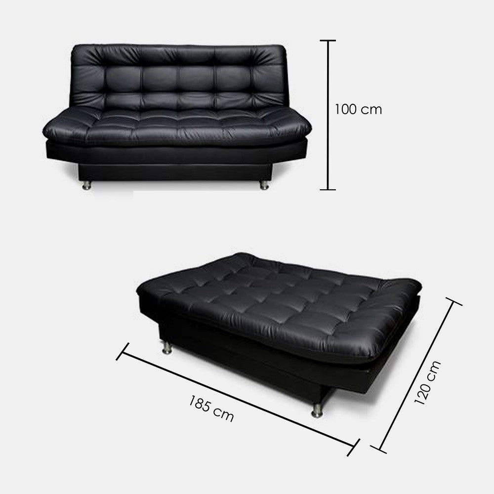 Sofá cama 3 cuerpos y 3 posiciones: modo sofá, reclinado y cama. Con diseño funcional. Ideal para optimizar tus espacios con máximo confort. Tapizado en tipo cuero PVC y patas en acero inoxidable con antideslizante, especial para evitar daños en el piso. Estructura en madera inmunizada y espumas de alta densidad.